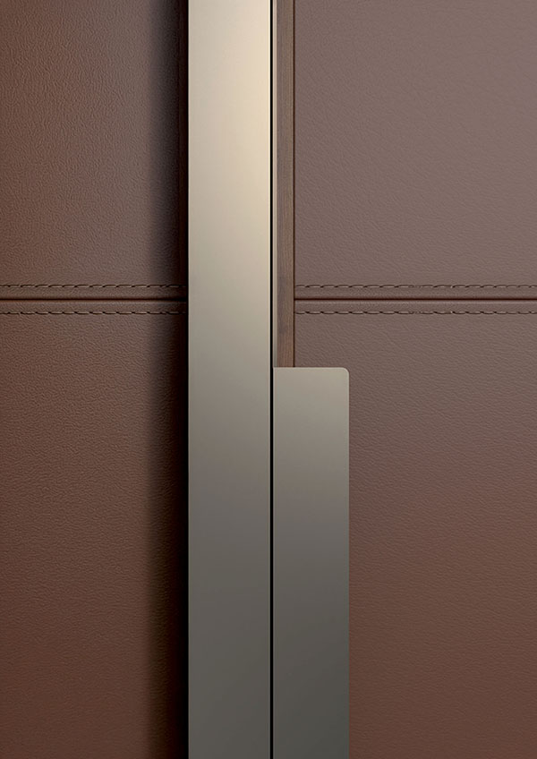 Las puertas, con marco en madera maciza de nogal canaletto, están disponibles con acabado estriado en nogal canaletto, lacadas en mate o revestidas en cuero enriquecido con costuras realizadas con hilo a juego. Puertas con apertura push-pull o con tirador decorativo en metal pintado.